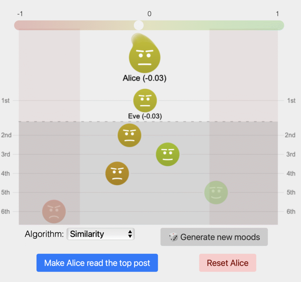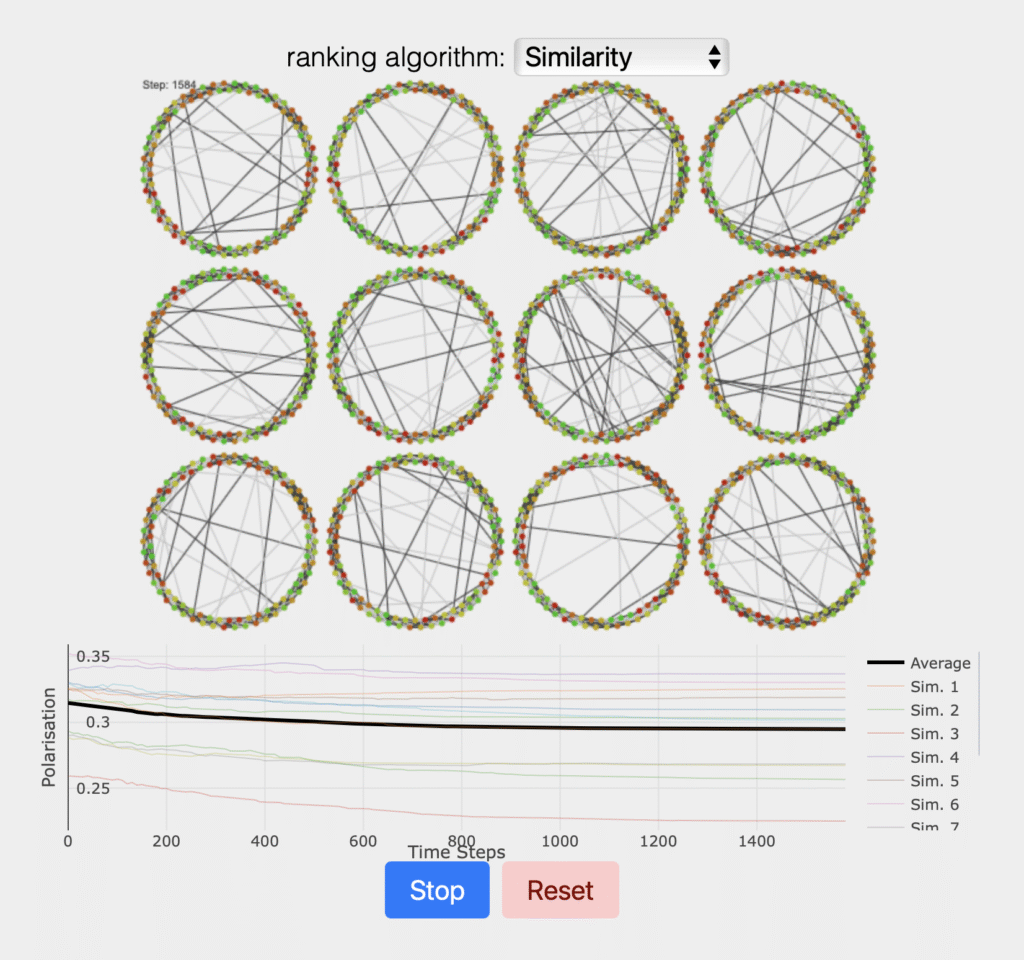 After getting an understanding of network dynamics, the user is asked to experiment with alternative platform mechanisms that determine what users (and their moods) influence their own fictive platform user. Based on the ranking algorithms the user sets, posts with different moods – again, aggressive to calm – will become visible to their fictive character, which influence their mood. From this individual level, the demonstrator then moves on to visualizing bigger networks in which many users influence each other based on the designated platform mechanics. To understand how users influence each other’s mood on OSNs, the user can run comparative simulations and experiment how polarization is fueled or minimized only through the ranking mechanics.